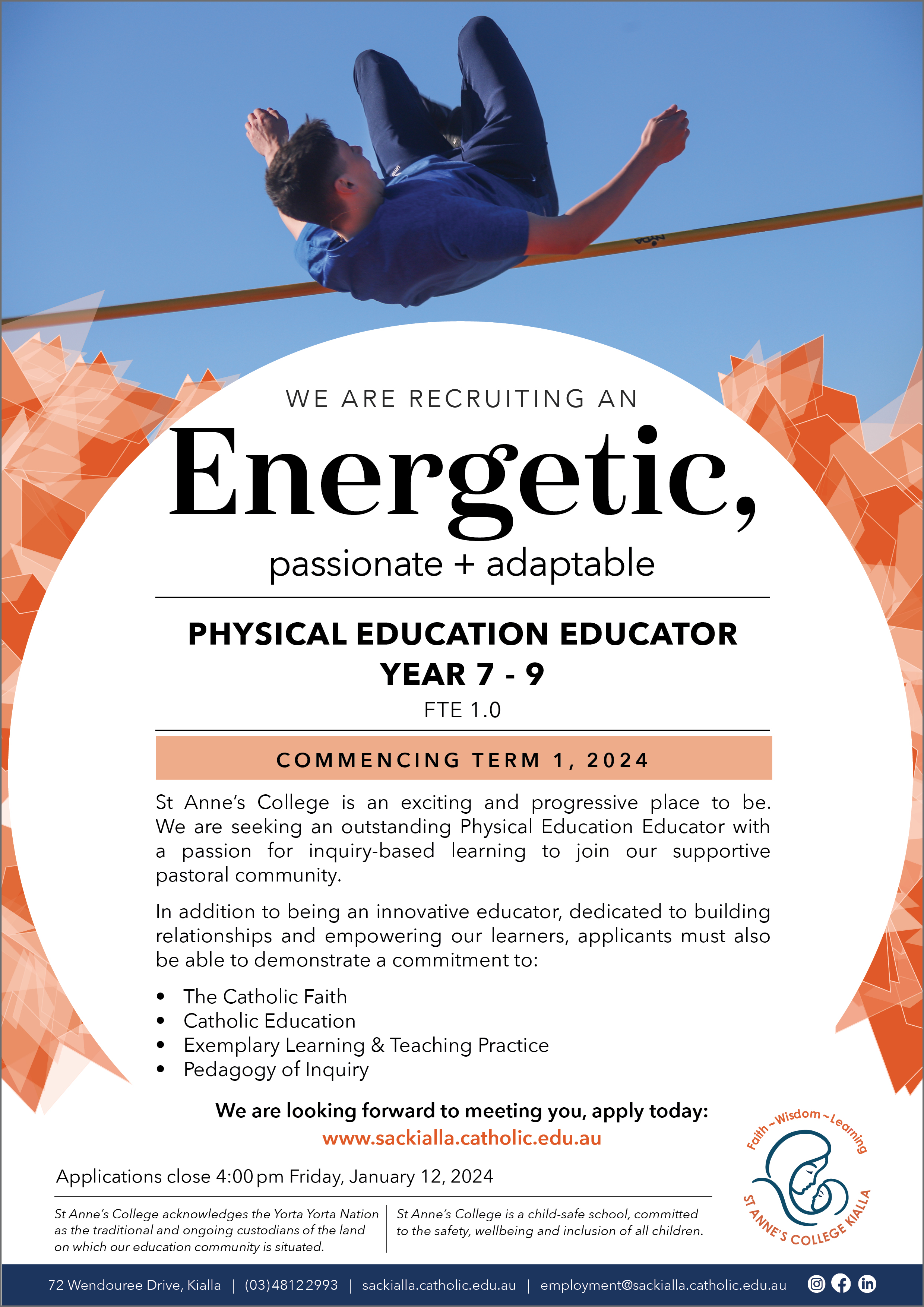 Image St Anne's College PE Specialist Teacher Position 2024 Job Advert (circulation) ( jpg, 2.45 MB )