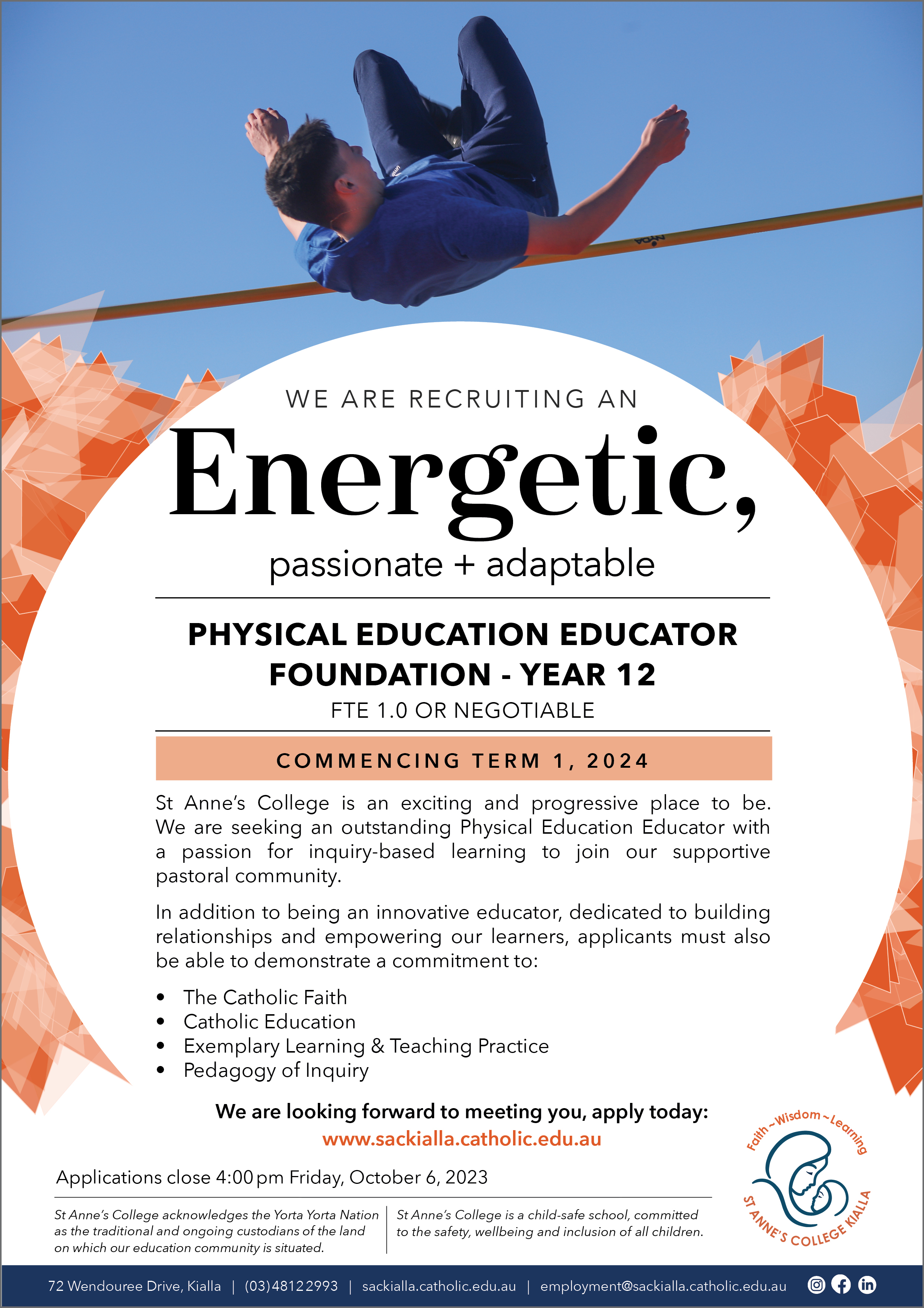 Image St Anne's College PE Specialist Teacher Position 2024 Job Advert (circulation) ( jpg, 2.45 MB )